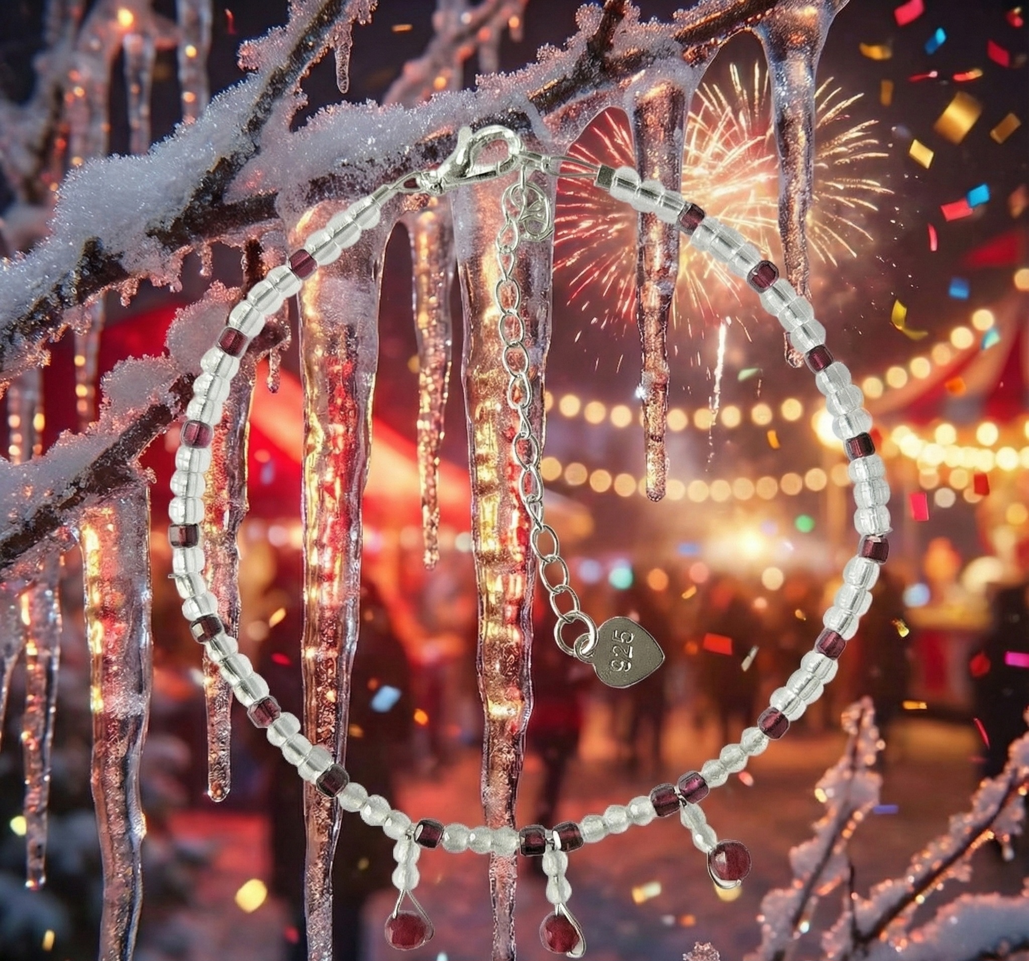 Gdy świat otula mróz, bransletka ,,Karminowy Żar " staje się Twoim osobistym źródłem ciepła i blasku. To biżuteria stworzona, by celebrować najgorętsze chwile w środku zimy. Hipnotyzujący, czerwony labradoryt i głęboki, nasycony chalcedon tworzą kompozycję pełną życia - niczym kieliszek szlachetnego wina wzniesiony podczas noworocznego toastu.