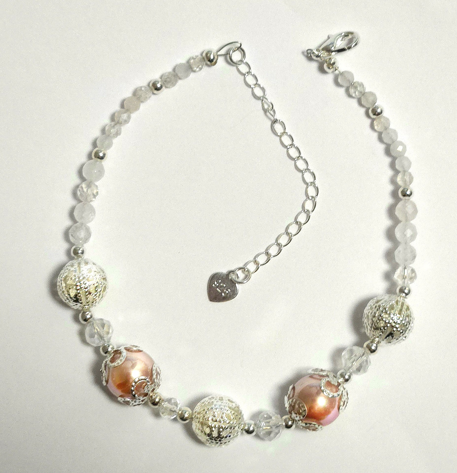 - Elementy dekoracyjne: Polerowane na wysoki połysk srebrne kuleczki dystansujące, umieszczone precyzyjnie między perłami.