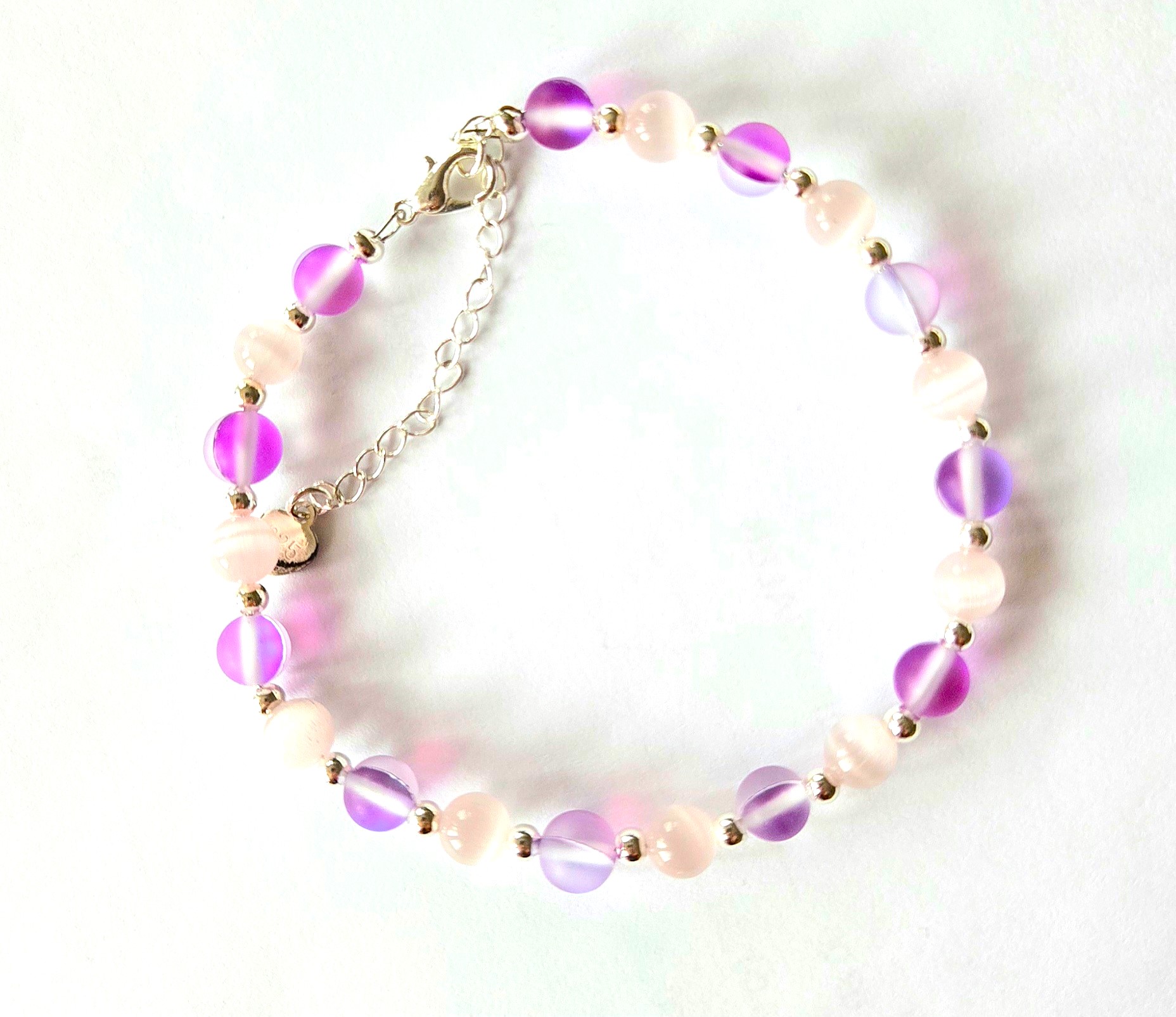 BRANSOLETKA ,,LAWENDOWY SZRON" Z KAMIENIA KOCIE OKO I KAMIENIA AUSTRIACKIEGO ZE SREBREM