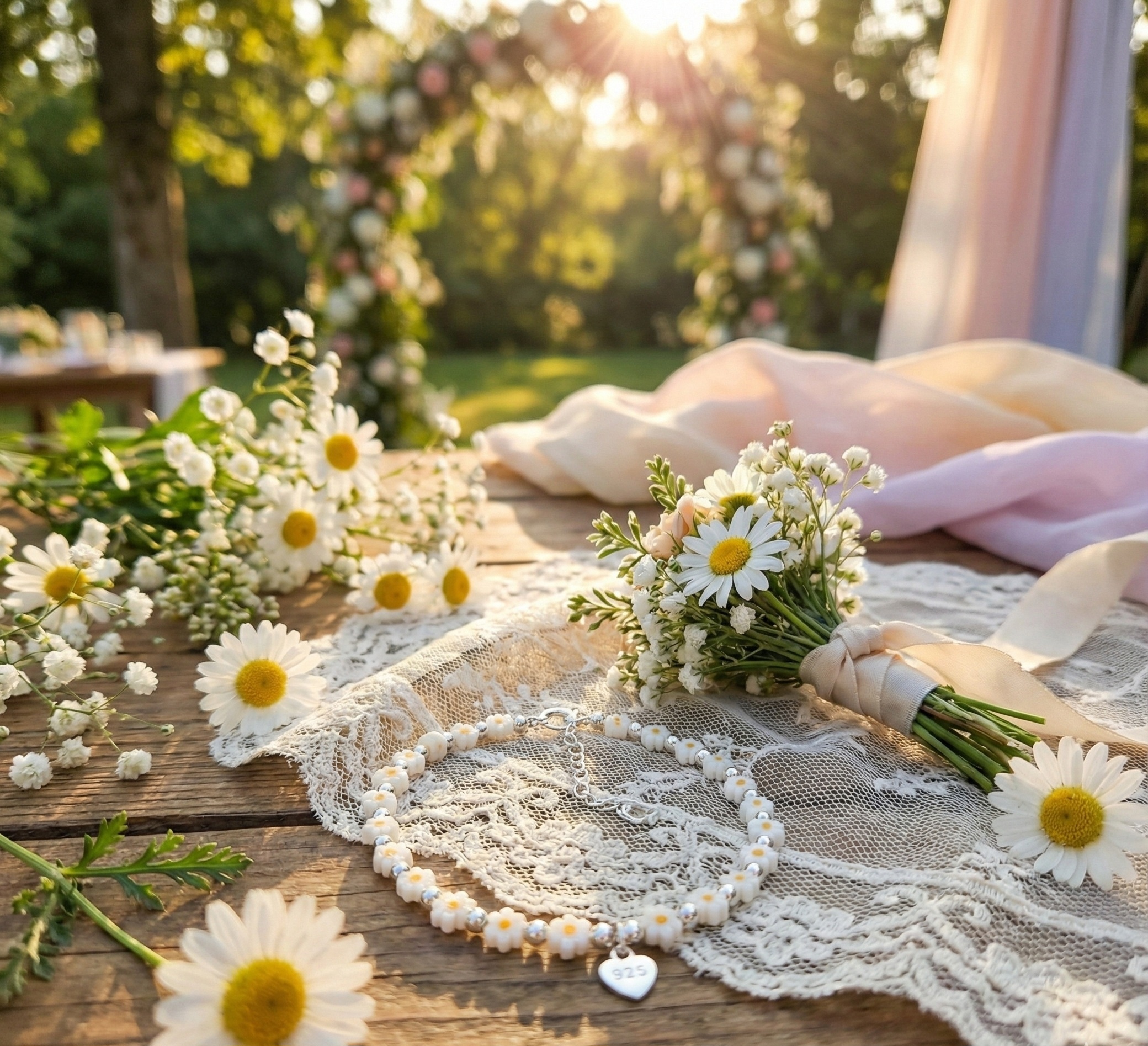 Szukasz bizuterii, która doda lekkości Twojej weselnej stylizacji? Bransoletka ,,Margaretki" to hit tego lata. Wykonana z wysokiej jakości koralików akrylowych i srebrnych kuleczek, doskonale wpisuje się w najmodniejsze trendy ślubne: Garden Party, Boho Chic i Slow Wedding.