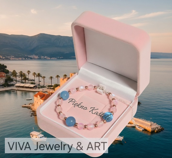 Bransoletka ,,Piękno Kasteli" to biżuteria o romantycznym charakterze, inspirowana unikalnym urokiem chorwackich Kasteli - siedmiu miasteczek położonych nad brzegiem Adriatyku. Każdy element opowiada historię i oddaje hołd temu malowniczemu miejscu, łącząc w sobie barwy morza, nieba i lądowego krajobrazu.