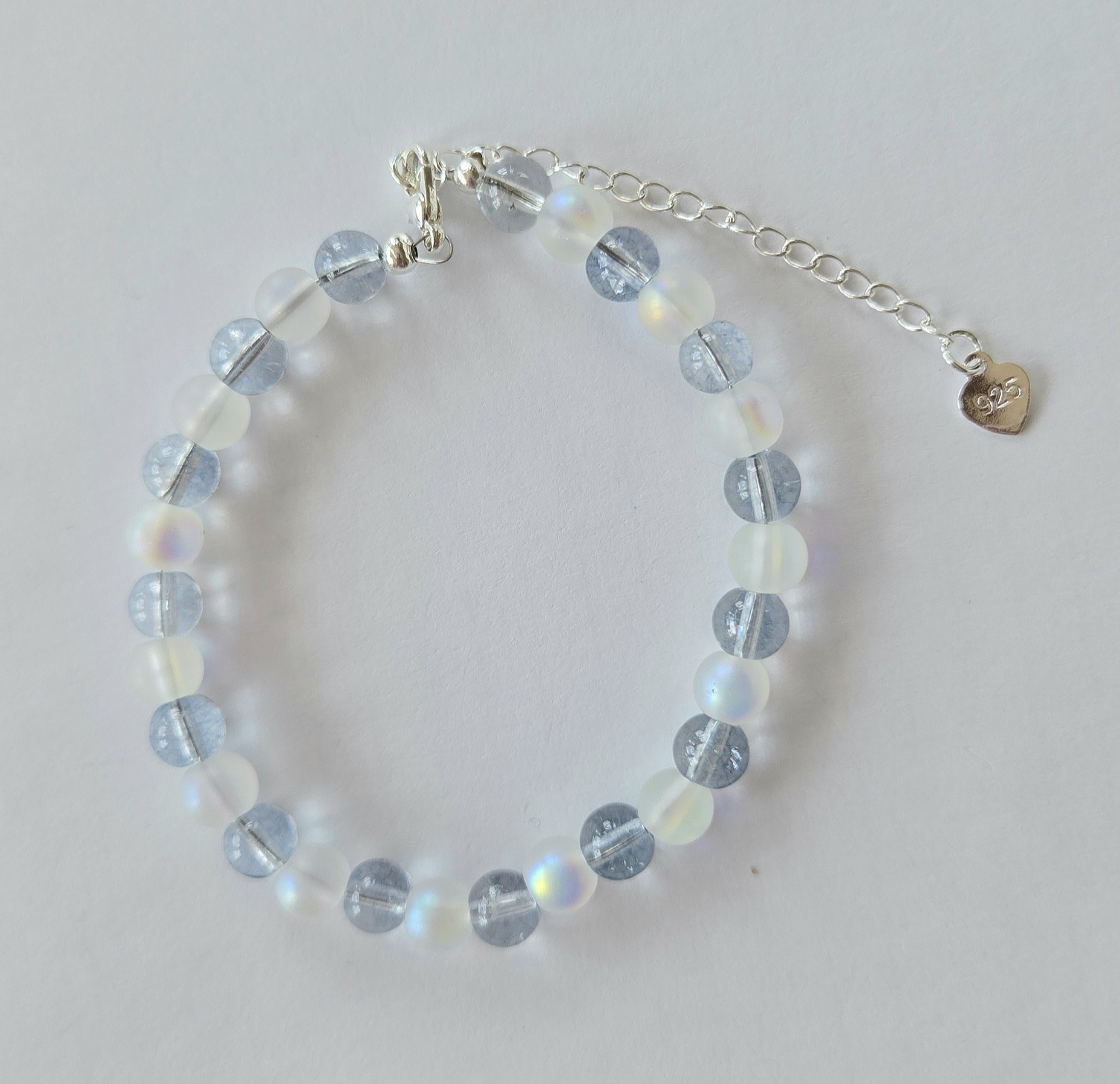 Centralnym elementem bransoletki jest starannie dobrany kamień księżycowy, słynący z delikatnej poświaty, przypominającej blask księżyca odbijającego się w tafli wody. Jego iryzacja, czyli efekt adularescencji, tworzy hipnotyzującą grę świateł, nadając bransoletce eteryczny i marzycielski charakter. Kamień księżycowy, tradycyjnie kojarzony z intuicją, emocjami i kobiecością, wnosi do projektu element spokoju i wewnętrznej harmonii.
