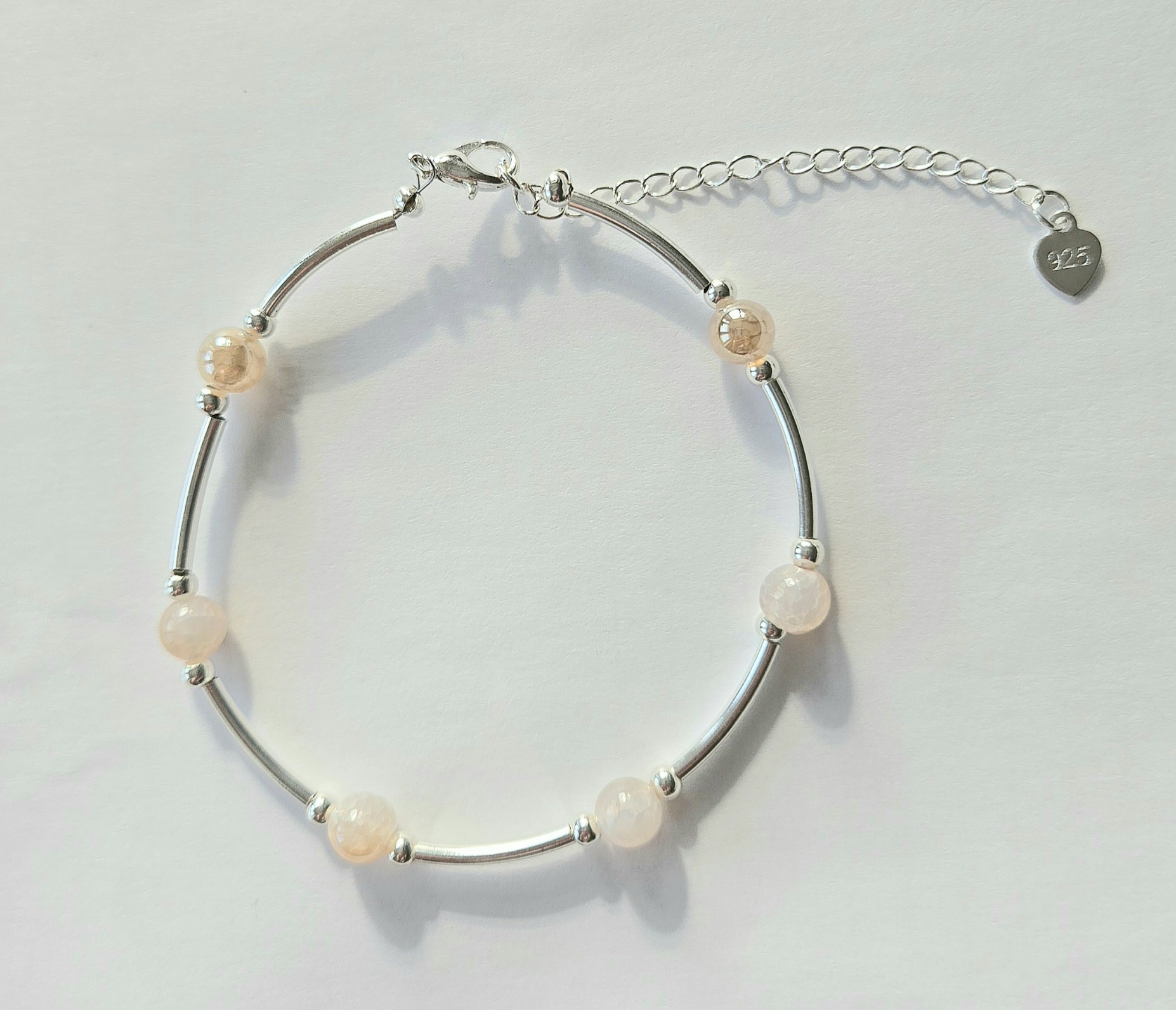 Odkryj niezwykły urok i subtelną elegancję z naszą bransoletką "Szampański Blask". To wyjątkowe połączenie szlachetnego agatu szampańskiego i lśniących, srebrnych elementów, które razem tworzą biżuterię idealną na każdą okazję.
