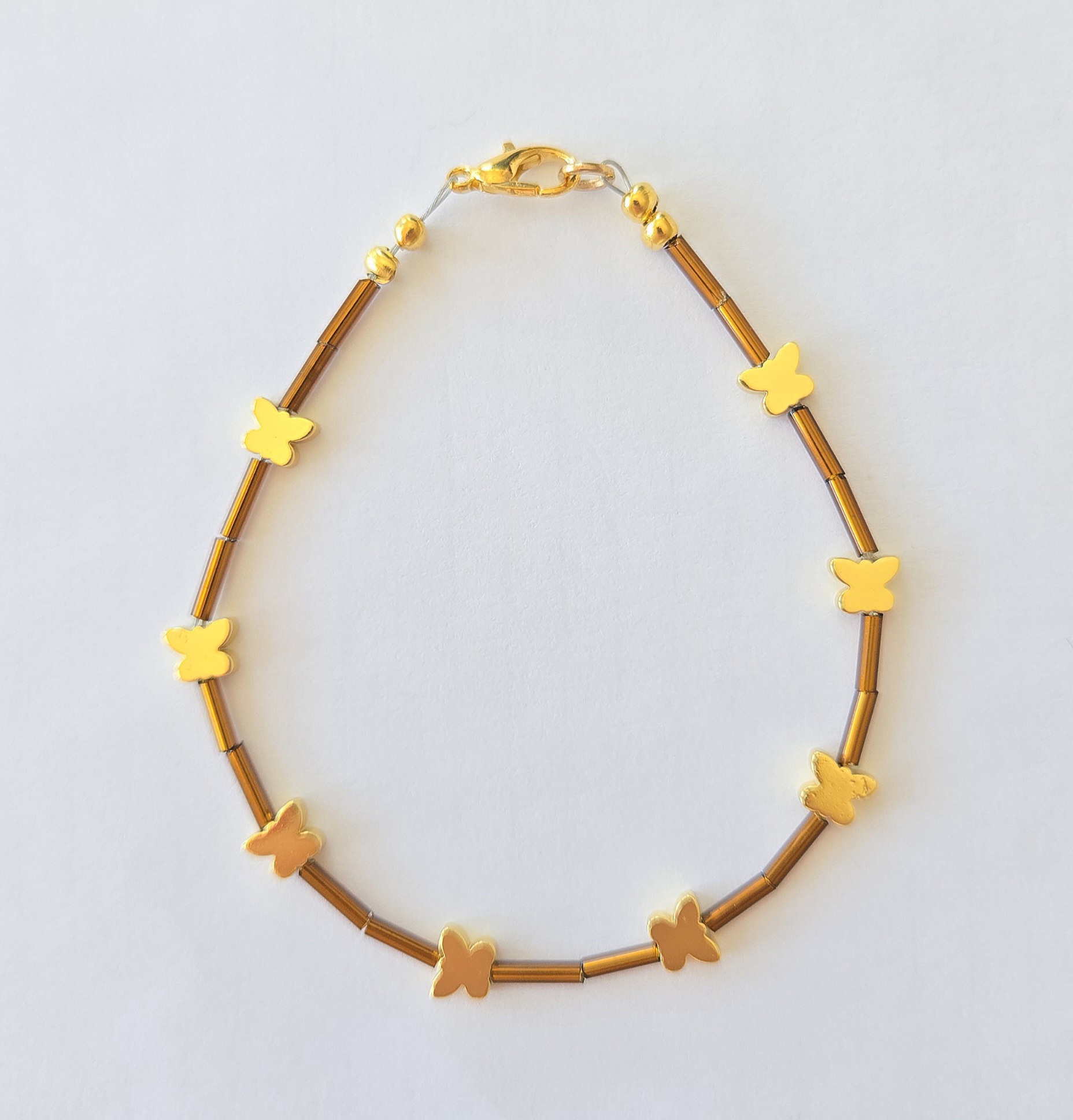 Bransoletka ,,Urok Motyla"z hematytów w kształcie motyli jest wykonana z dokładnością, ręcznie przez naszych rzemieślników - pasjonatów biżuterii. Hematyty są oddzielone od siebie szklanymi przekładkami w kolorze ciemnego złota, co nadaje jej lekkości i uroku. Nadaje się do noszenia na co dzień i na specjalne okazje.