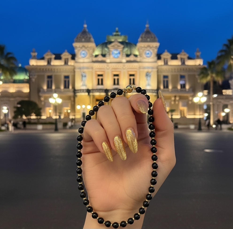 Urok granatowego chalcedonu podkreślają precyzyjnie wykonane, srebrne przekładki pozłacane 18-karatowym złotem. Te lśniące elementy dodają naszyjnikowi królewskiego charakteru i ciepłego blasku. Połączenie granatu ze złotem to klasyczna, ponadczasowa kompozycja, która zawsze zachwyca i idealnie pasuje do różnorodnych stylizacji – od codziennych, po wieczorowe.
