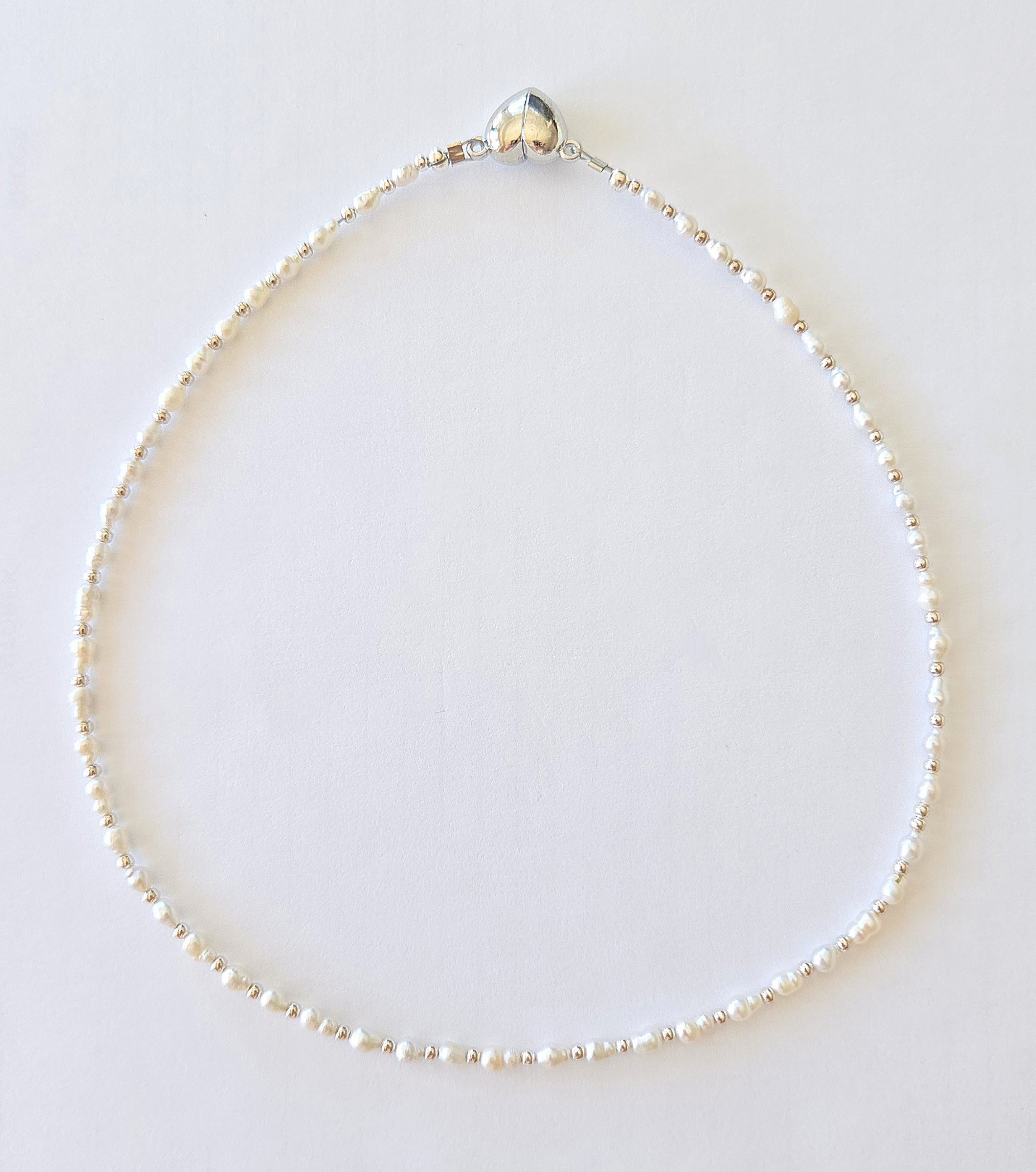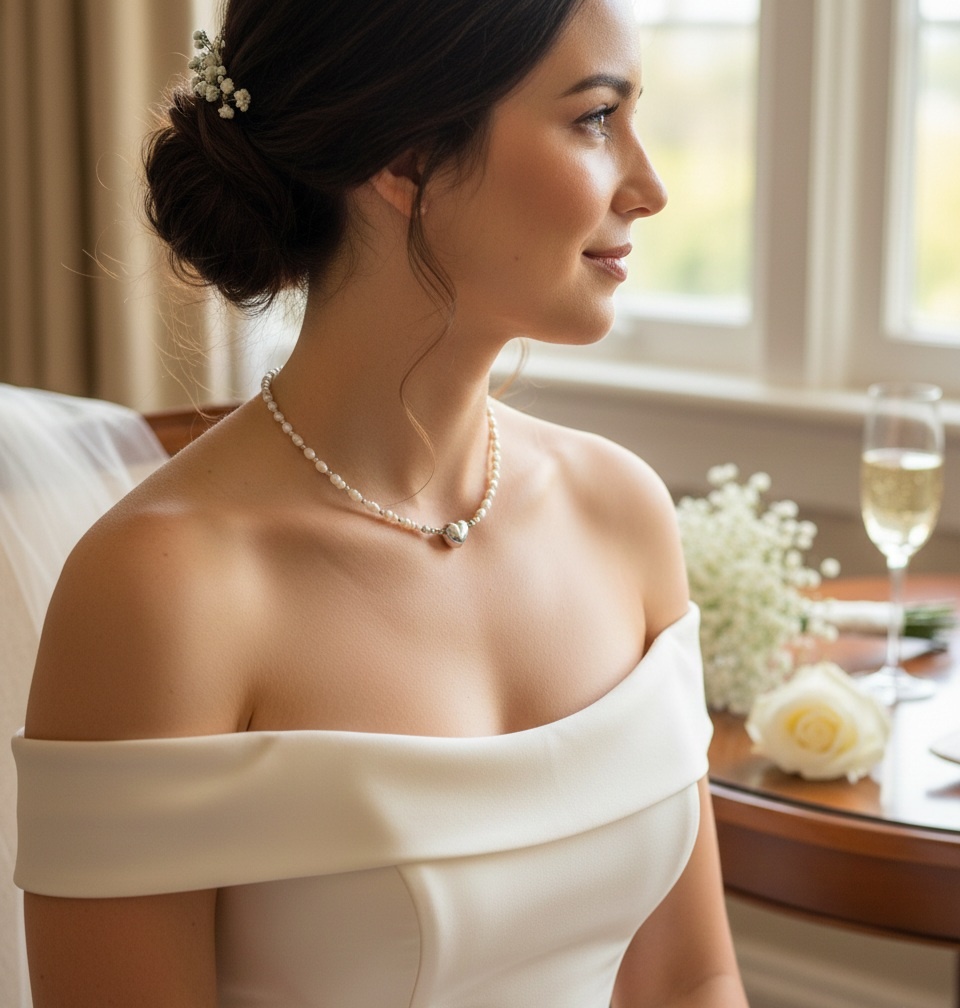 Naszyjnik ,,Czystość Pereł" to delikatna, eteryczna nić utkana z najdrobniejszych pereł - niczym zbiór cichych obietnic i najszczerszych westchnień. Każda perełka, mała i nieregularna, symbolizuje wyjątkowość i piękno chwil, króre składają się na całe życie, a także te chwile, które doprowadziły Was do ołtarza.