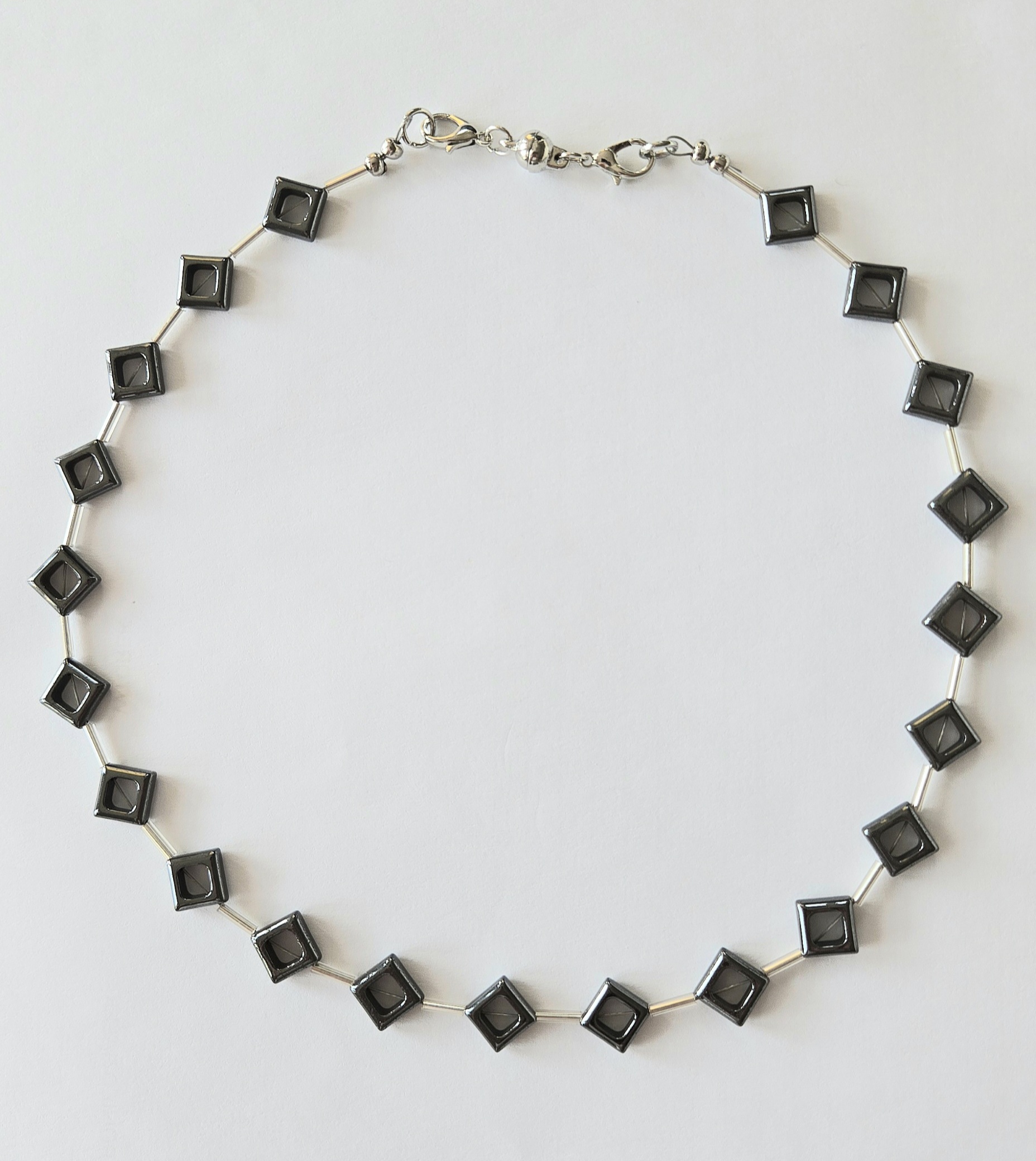 Każdy z rombów hematytu lśni metalicznym blaskiem, niczym odbicie nocnego nieba. To biżuteria, która opowiada historię: o pięknie, które nie potrzebuje krzykliwych kolorów, by zachwycać, o sile, która kryje się w spokoju. Powierzchnia hematytu, niczym idealnie oszlifowany diament, odbija swiatło w subtelnym, migotliwym tańcu cieni, dodając kompzycji wyjątkowej głębi.