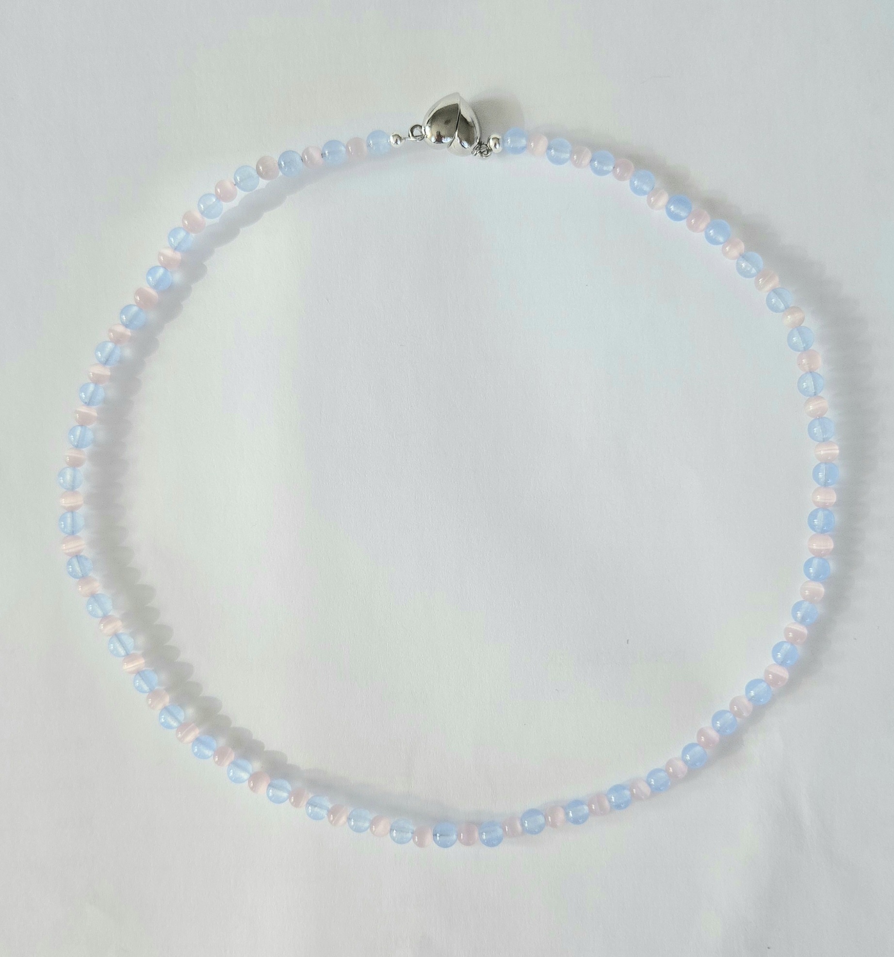 Kamienie kocie oko, znane ze swojego charakterystycznego, smużkowego połysku, pięknie odbijają światło, tworząc efekt kociej źrenicy. Błękitne i różowe koraliki doskonale ze sobą współgrają, symbolizując równowagę i łagodność. Błękit kojarzy się ze spokojem, harmonią i głębią, natomiast róż z miłością, delikatnością i kobiecością. Połączenie tych dwóch barw tworzy kompozycję, która otula noszącą ją osobę aurą spokoju i pozytywnej energii.