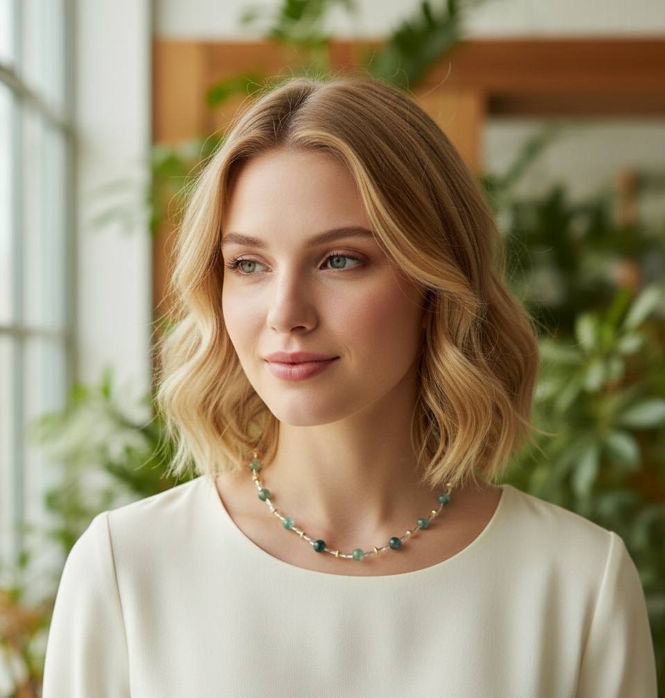 Każdy z przejrzystych, zielonych agatów jest echem magicznego ogrodu. Ich głęboki, leśny odcień symbolizuje harmonię, spokój i odnowę, niczym wiecznie zielone drzewa, które rosły w tym sekretnym miejscu. Przeplatają się z nimi kuleczki srebra pozłacanego 18 - karatowym złotem - to właśnie one stanowią odniesienie do legendarnych, złotych jabłek, które nimfy pilnie strzegły. Złote jabłka to symbol nieśmiertelości i wiecznej młodości. Ciepły, promienny blask pozłacanych przekładek kontrastuje z chłodną zielenią agatów, tworząc kompozycję pełną zmysłowości i elegancji.