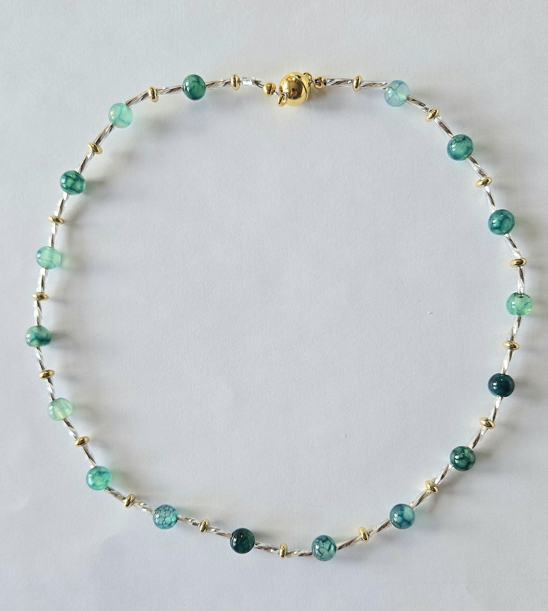 • NASZYJNIK ,,OGRÓD HESPERYD" Z AGATÓW I SREBRA POZŁACANEGO 18 - KARATOWYM ZŁOTEM
