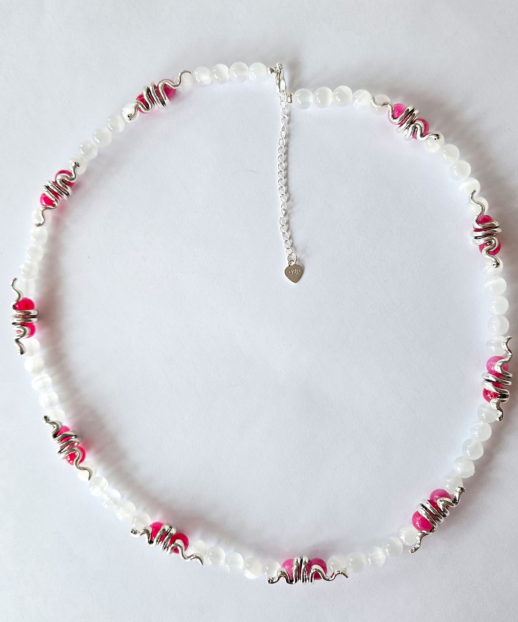 Odkryj biżuterię, która zamyka w sobie magię mroźnej, księżycowej nocy i delikatność pierwszych promieni zimowego słońca. Ten wyjątkwy naszyjnik to harmonijny taniec dwóch niezwykłych minerałów. Eteryczny kamień księżycowy lśni chłodnym, białym blaskiem, przywodząc na myśl skrzący się śnieg i skute lodem jeziora. Jego surowość przełamuje różowy angelit - kamień anielskiego spokoju, wnoszący ciepło i łagodność, niczym rumieniec na mrozie.