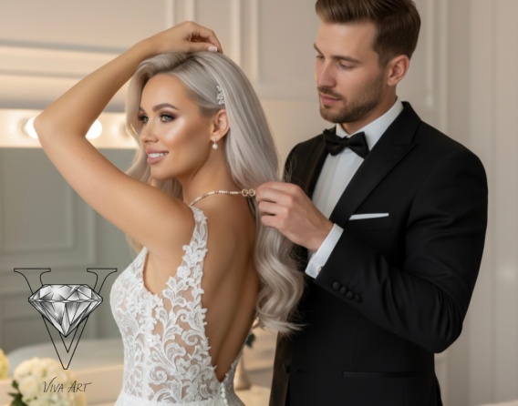 Dla Niego ,,Wieczna Oblubienica" to spełnienie najskrytszych marzeń. Oczami wyobraźni widzimy Pana Młodego, którego serce przepełnia nieopisana radość i duma. Dzień ślubu to dla niego ukoronowanie długich zalotów, cierpliwych starań i bezgranicznego oddania. Każda perła i każdy błyszczący element tego naszyjnika odzierciedla szczęście i wdzięczność, że Ona, ta Jedyna, zgodziła się dzielić z nim wieczność.