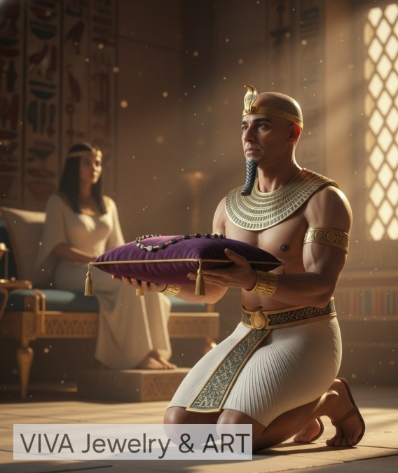 Faraon wkroczył do komnaty, niosąc naszyjnik na jedwabnej poduszce. Przyklęknął przed Królową i zwrócił się do niej tymi słowami:
